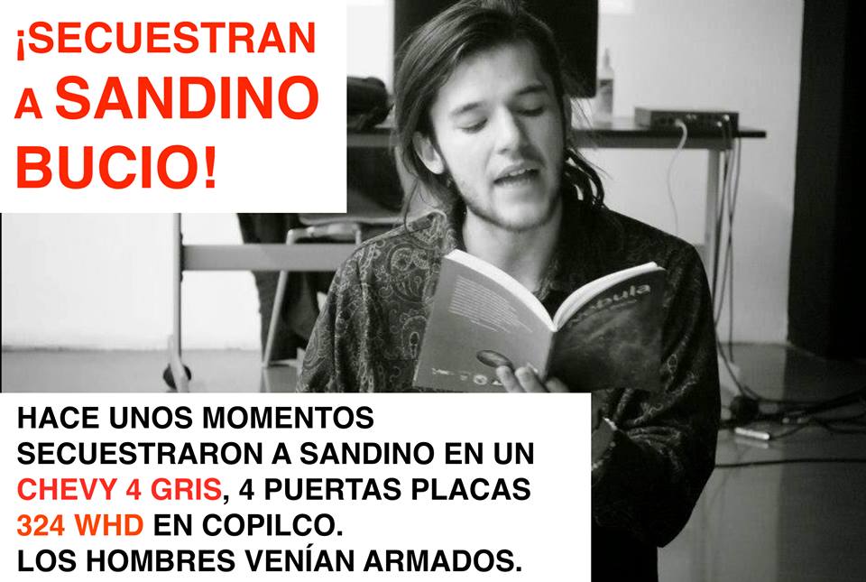 Este viernes las redes sociales han estallado con el informe de otro caso de secuestro de un estudiante activista mexicano. Según informa la emisora Regeneración Radio, se trata del estudiante de la Facultad de Filosofía y Letras de la Universidad Autónoma de México (UNAM) Sandino Bucio Dovalí, quien fue subido a un Chevy gris con placa 324 WHD por dos hombres armados. El joven es conocido por su activismo y participación en el movimiento ciudadano-estudiantil #YoSoy132, opositor al presidente de la República Enrique Peña Nieto.